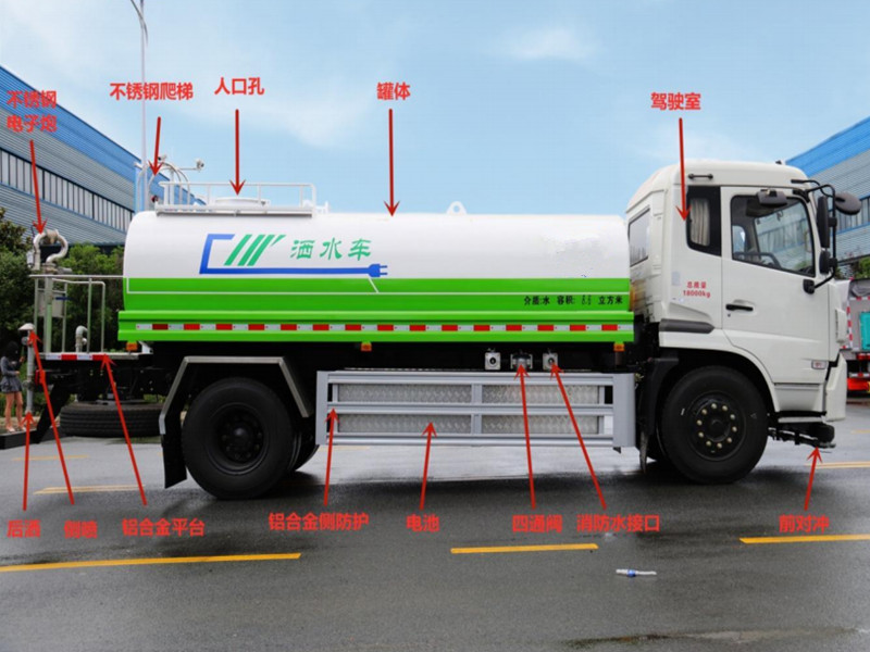 東風 5 方純電動灑水車底盤型號:EQ1090KACEV,3300mm 軸距,磷酸鐵鋰電池,永磁同步電機,整車電量 144kwh,充電時間 1h,滿載工況行駛里程 300km。 上裝容積 4.7 立方,罐體采用 Q235 優質碳鋼材質,40-50 灑水水泵,全自動前沖、后灑、高炮,可在駕駛室一鍵操作灑水功能。高炮射程可達 35 米以上。