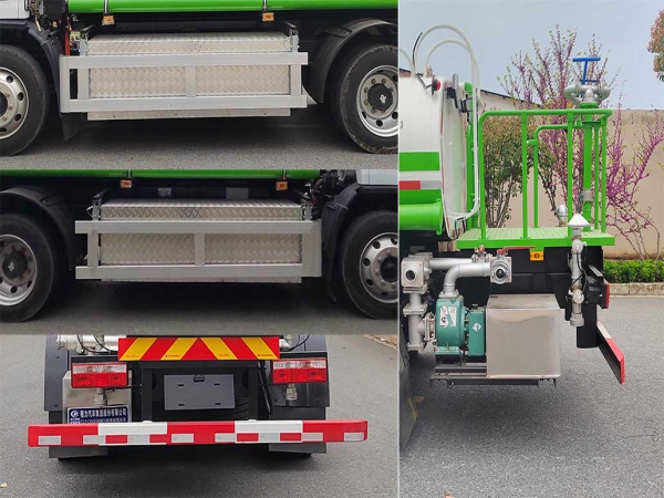 其它 | 11.該車專用裝置由水罐、灑水機構等組成,實現園林綠化灑水及路面灑水;2.ABS型號/生產廠家:CM4XL-4S/4M/廣州瑞立科密汽車電子股份有限公司;3.電池種類/生產企業:磷酸鐵鋰電池/湖北億緯動力有限公司,電機額定/峰值功率分別為:150kW/220kW;4.側防護裝置材料為鋁合金,連接方式為螺栓連接,后下部防護裝置材料Q345A,螺栓連接,后下部防護斷面尺寸:120×60(mm),離地高度460mm;5.裝備具有衛星定位功能的行駛記錄;6.可選裝直接供電式ETC車載裝置;7.罐體總容積:5.76立方米,罐體有效容積:5.49立方米,介質:水,介質密度:1000千克/立方米,罐體外形尺寸(長×長軸×短軸(mm)):4000×1710×1160. 選裝外觀噴圖,選裝噴灑裝置連接件樣式 | ||